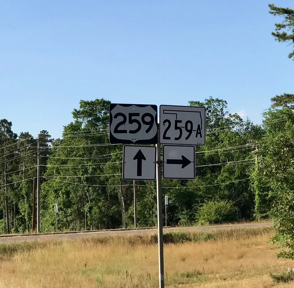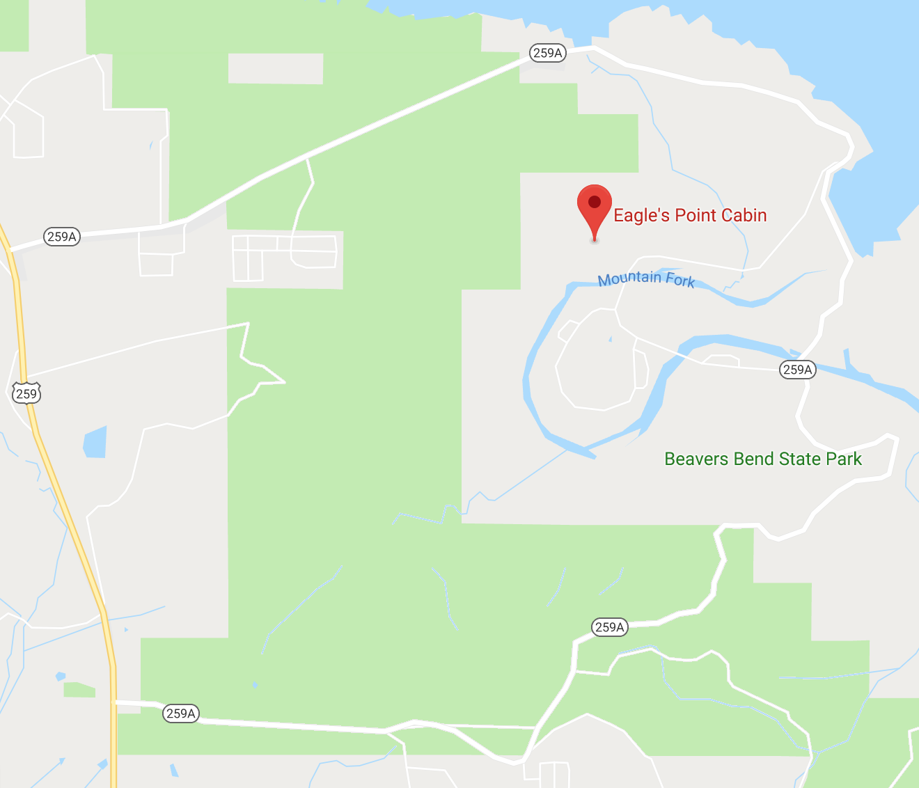 259 runs North and South through Broken Bow and Hochatown (north of Broken Bow). As you drive north on 259 from Broken Bow toward Beaver's Bend State Park, you will encounter 259A twice. Take a right at the second 259A entrance across the street from the bank.